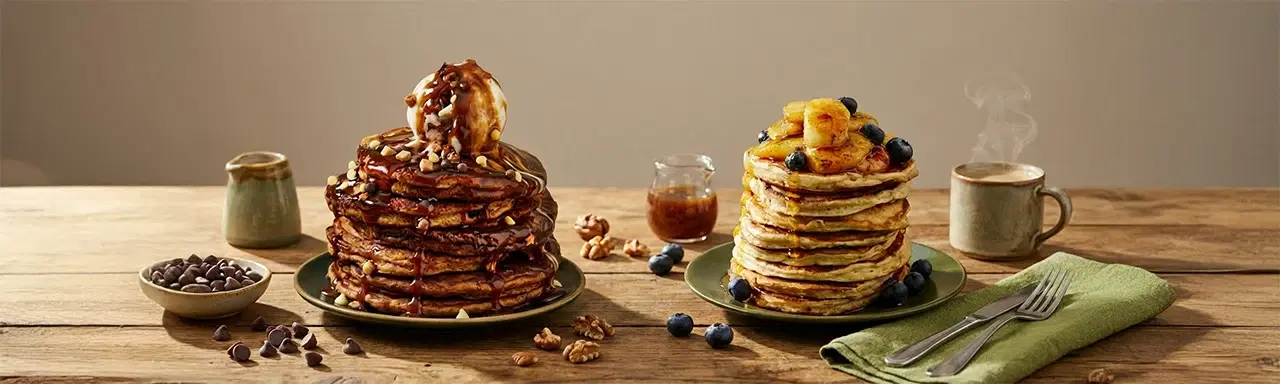 Imagine stacks of warm pancakes topped with berries, chocolate drizzle, or classic lemon and sugar… ready in minutes.