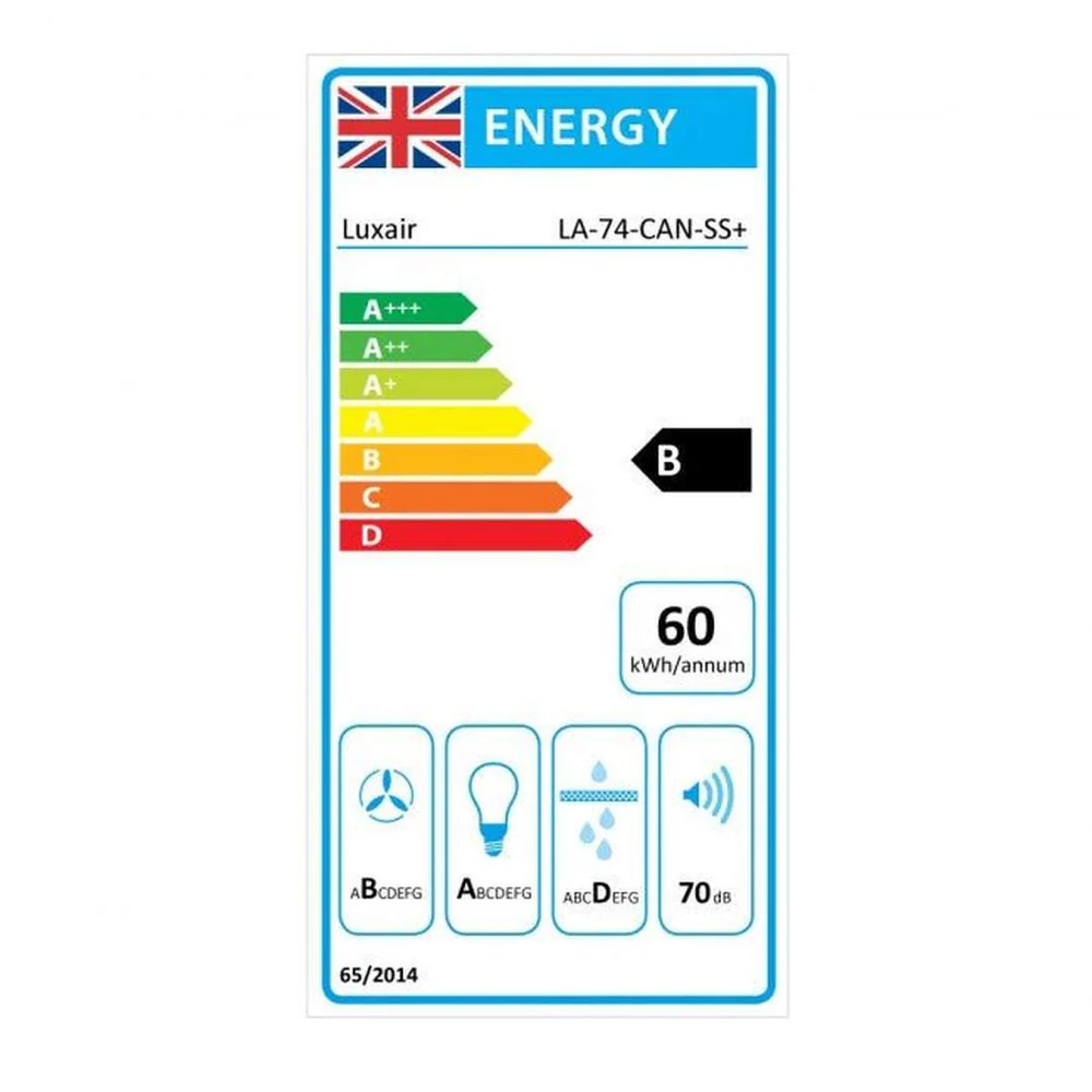 The Luxair LA-74-CAN-SS+ features an Energy Rating of B, offering a good balance between strong extraction power and efficient energy use — ideal for busy family kitchens.