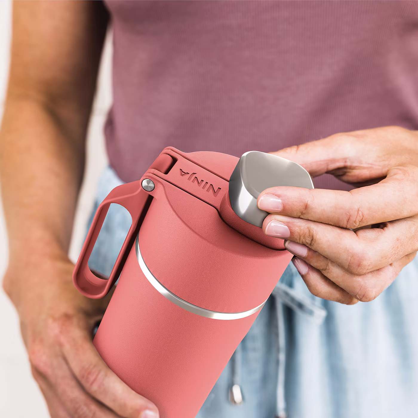 The Ninja Thirsti isn’t just practical — it’s stylish too. With a smooth matt finish and bold colour options like Coral, it’s a bottle you’ll be proud to carry. Ergonomic grooves give you a comfortable grip, while the sleek shape fits easily into most cup holders and bags.