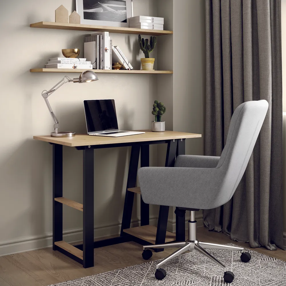 The combination of a warm oak-effect finish and sleek black metal frame gives this desk a modern industrial look that complements a wide range of interiors—from minimalist to contemporary homes.