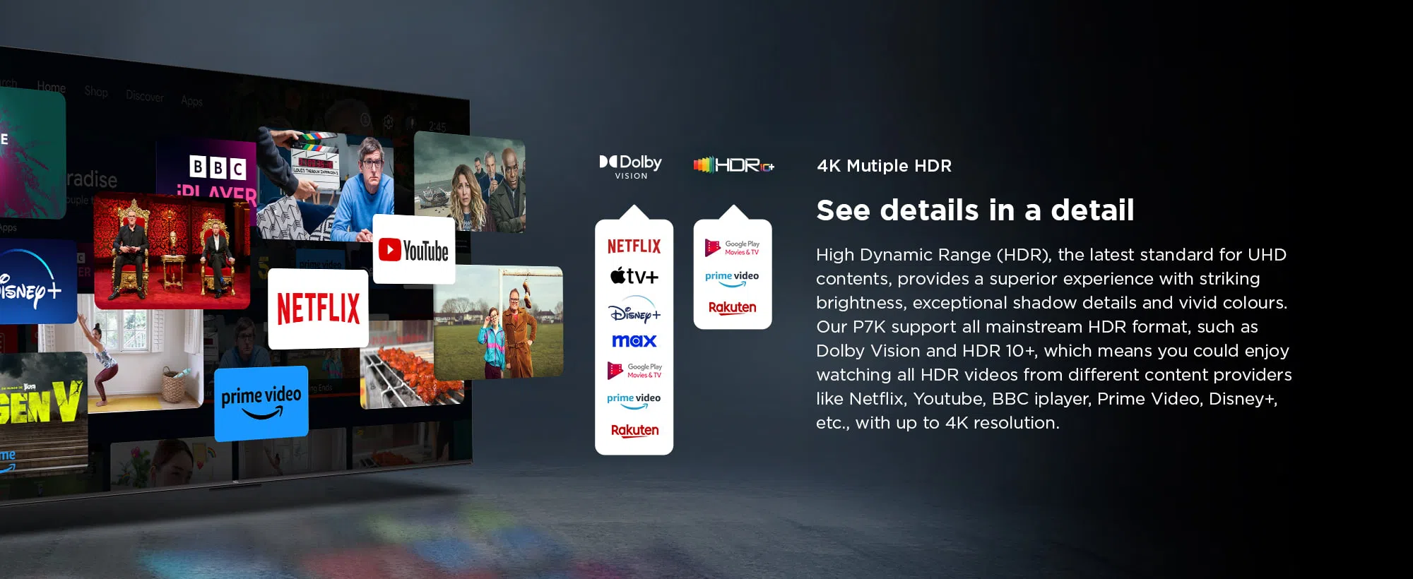 • Supports Dolby Vision, HDR10+ & HLG for stunning HDR performance