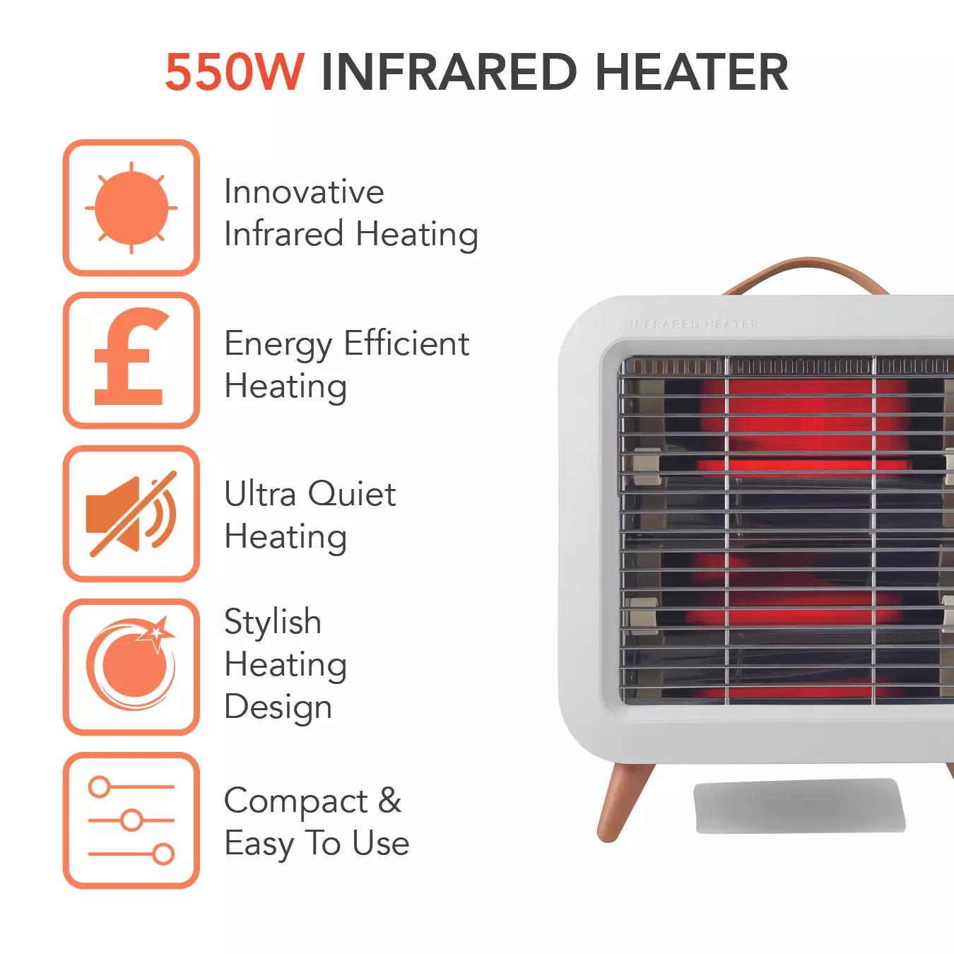 550 W infrared output for fast, effective warmth where you need it most.